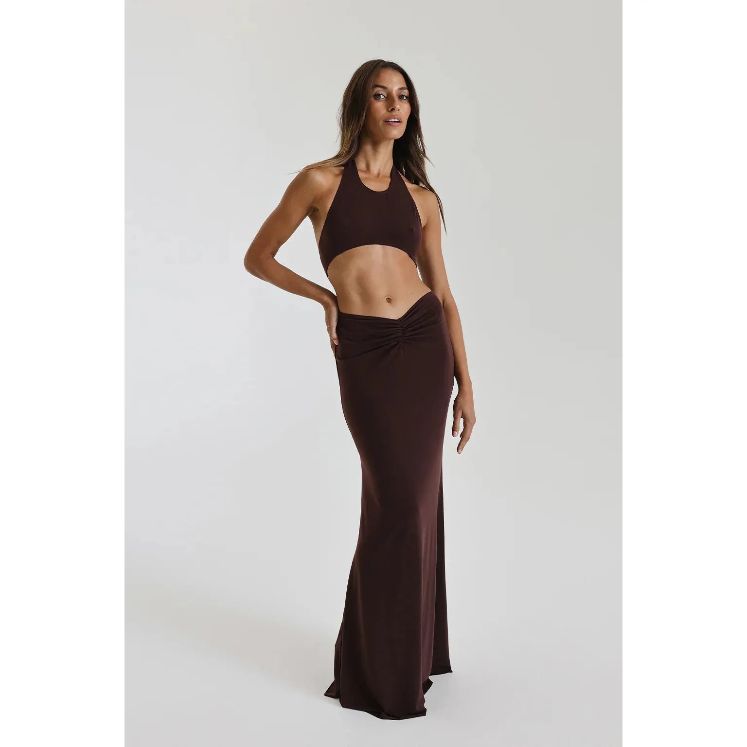 An athleisure aesthetic meets feminine notions. The Jasmine Dress showcases a high neck halter crop, connected to a full length skirt through cross over detail at a generous open back. A dipped waistline meets at centre-front gather to follow the feminine figure and accentuate its shape.