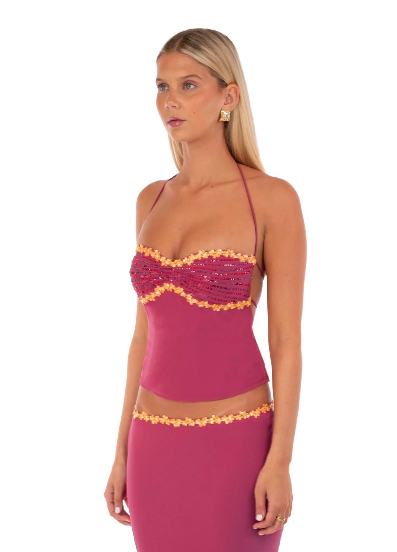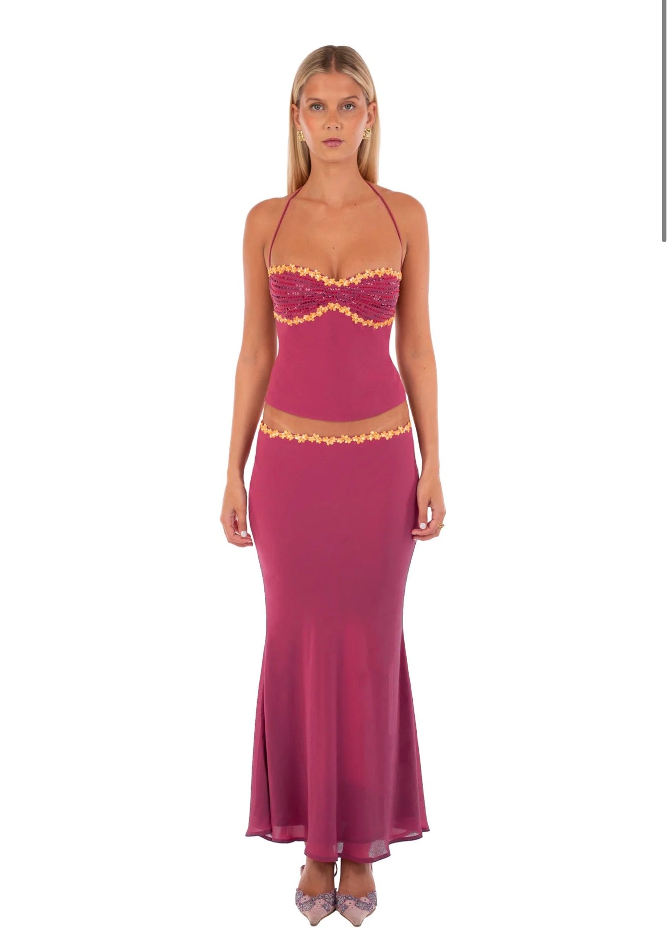 Jemima Set features a halter handed beaded top and matching skirt in colour wine.