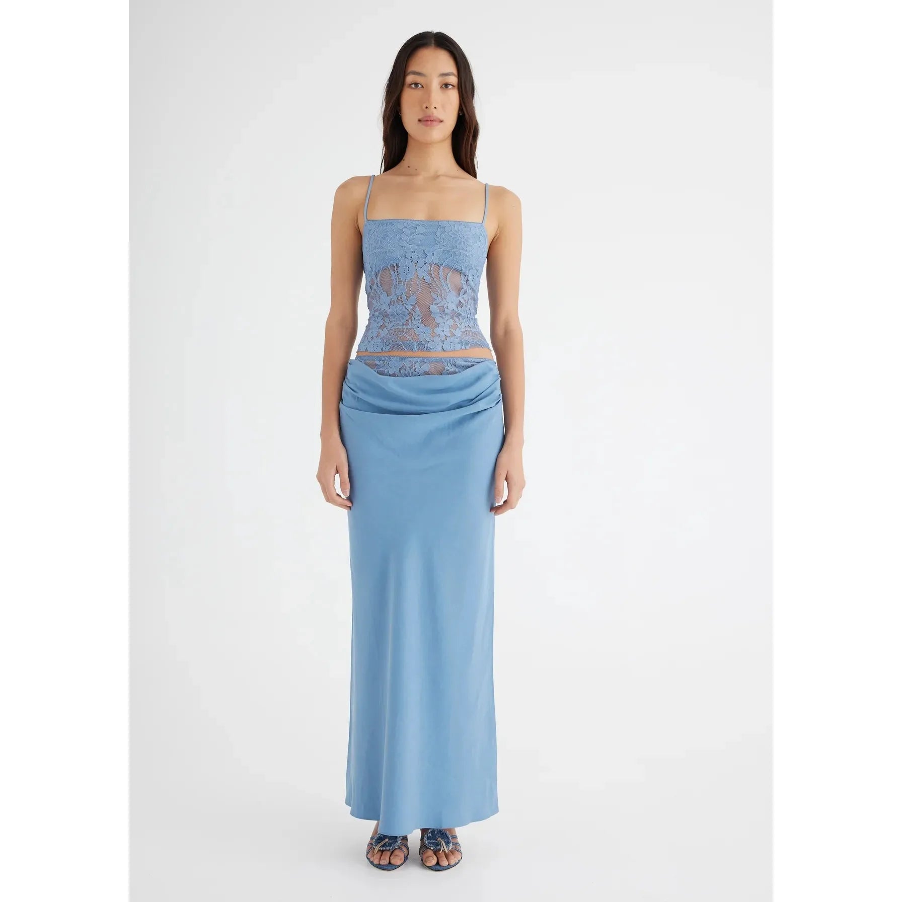 The Miko skirt offers unique silhouette with its built-in panty featuring a thong bottom made of stretch lace. Its bias cut cupro skirt with cowl at the front is an update to the beloved Valentino skirt from last season. For a complete and effortless look, pair it with the Miko Cami.