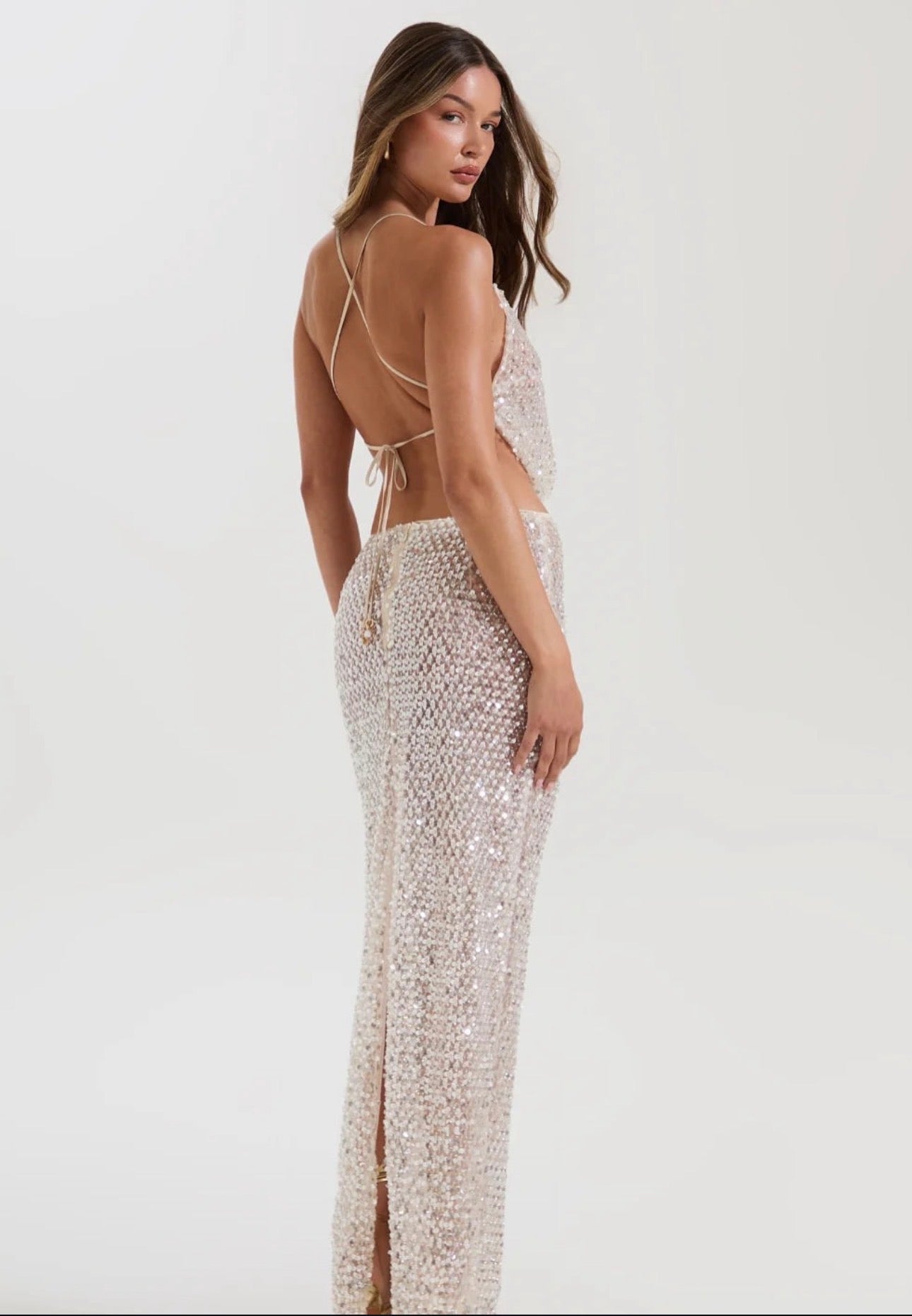 Introducing Quartz: our viral Crystal Co-Ord — a breathtaking two-piece designed to make every entrance unforgettable. Crafted in our signature, one-of-a-kind embellished fabric, a mix of sequins and beads reflect every drop of light for the ultimate sparkle. This shimmering co-ord features a draped, adjustable top with an open back and delicate straps for a flawless fit.