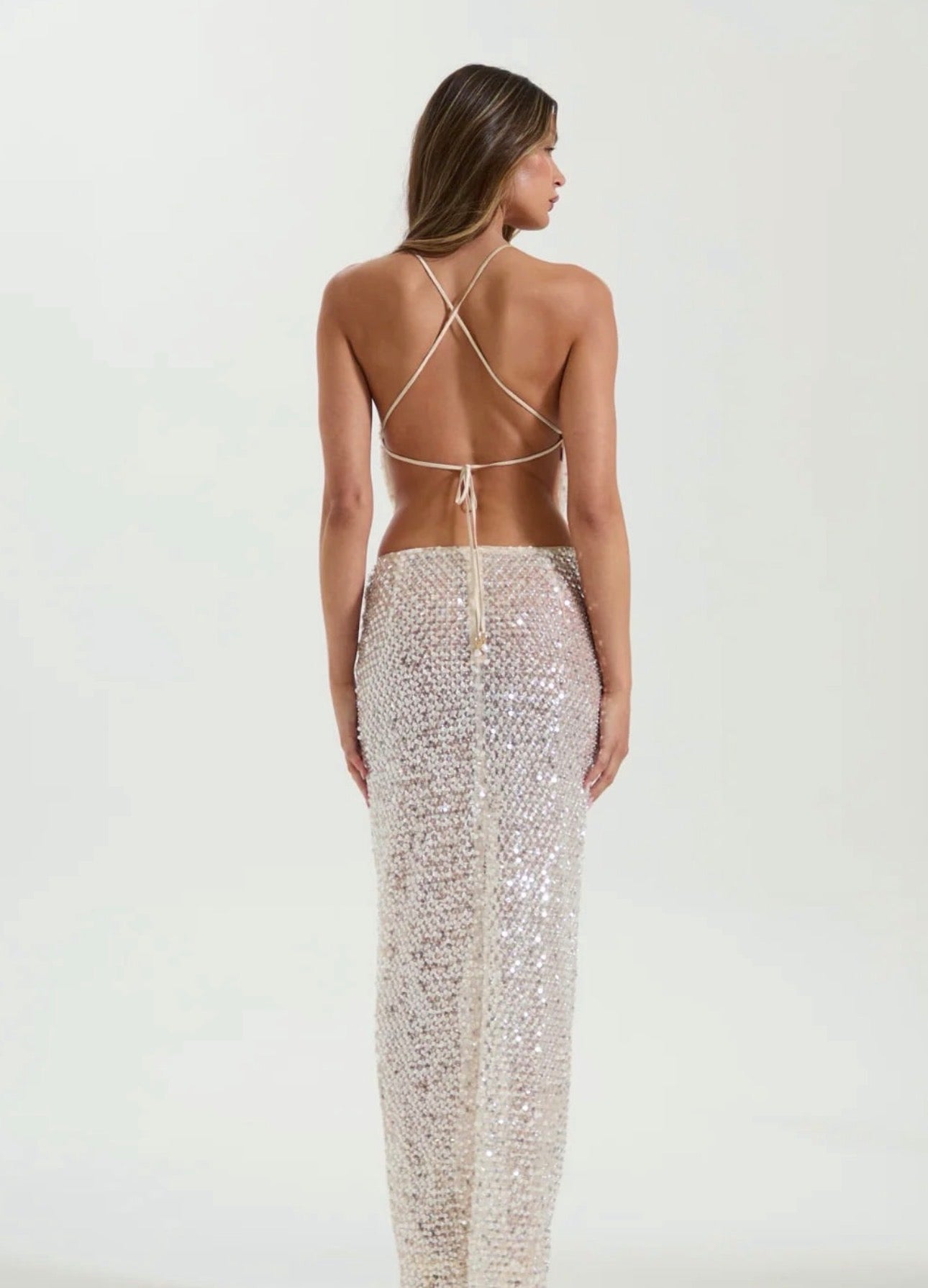 The coordinating maxi skirt can be styled low on the hips or higher on the waist, depending on your mood, and includes a discreet zip for added comfort. This semi-sheer set is fully lined in mesh for added comfort and we recommend pairing with a high-waist, skin-toned brief for a seamless finish. Quartz is the ultimate party-ready statement for those who want to own the spotlight.