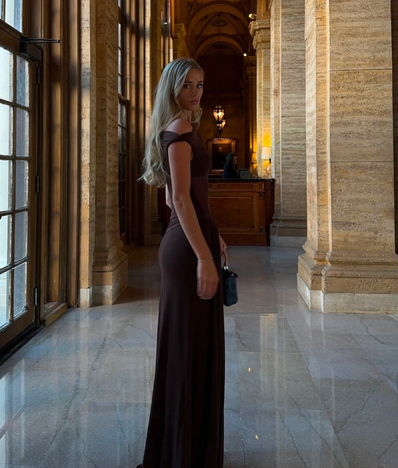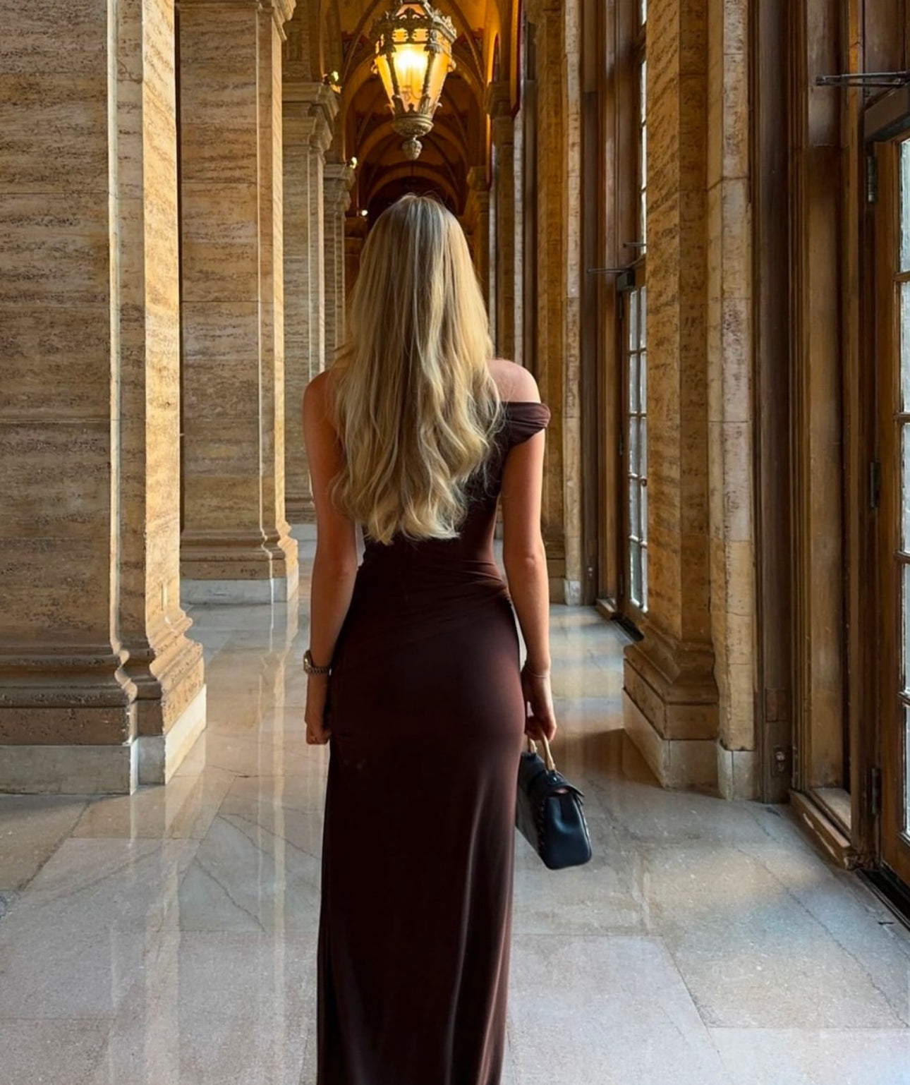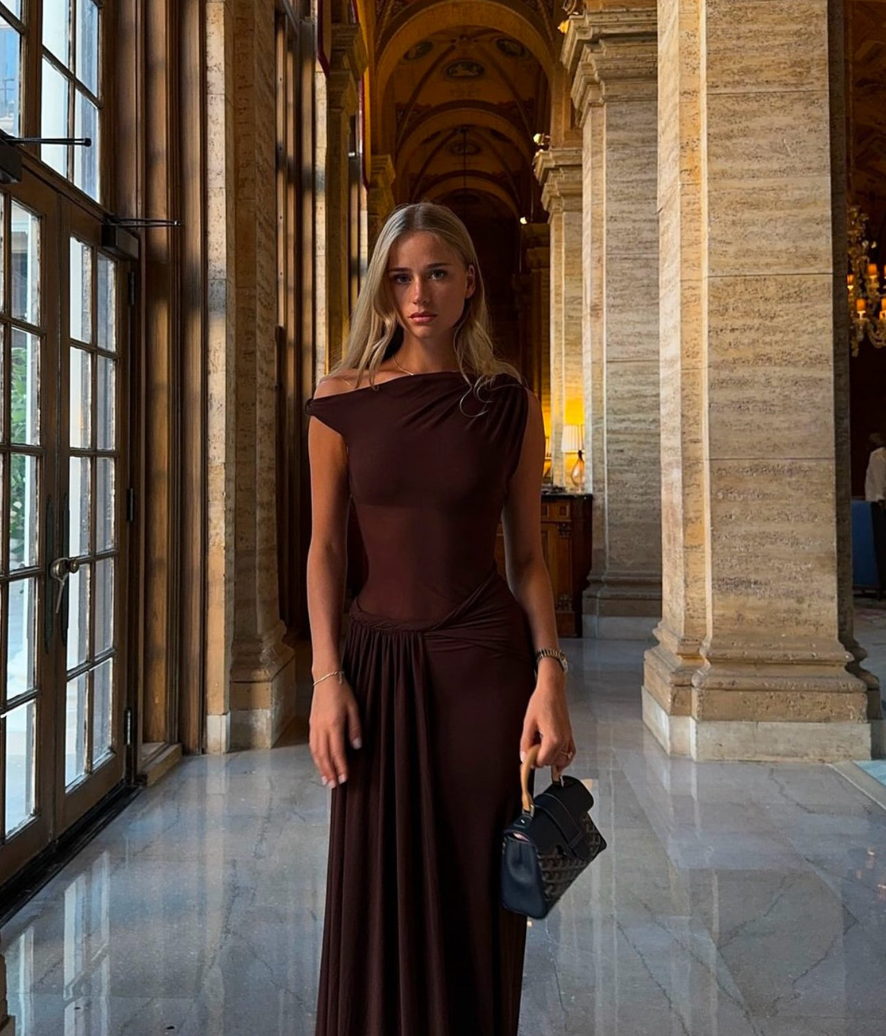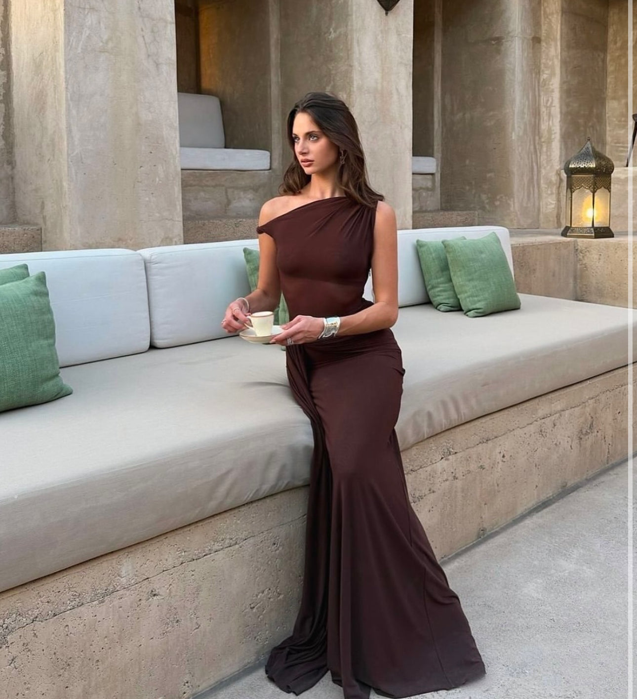 The 'Sisal' Mesh Maxi Dress in Espresso, an effortless, yet sexy draped silhouette that skims the body.